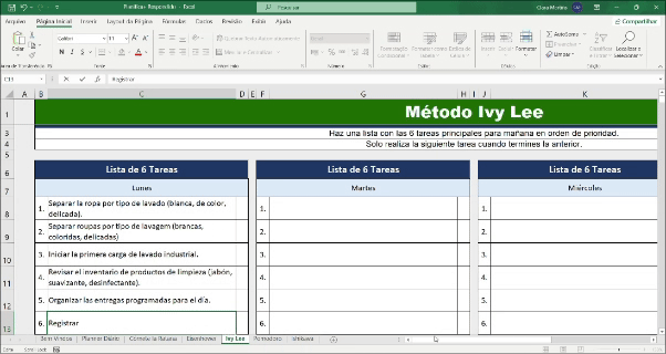 Enumera las 6 tareas principales del día en orden de prioridad y completa una a la vez, con claridad y disciplina.